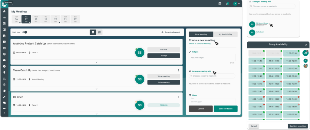 d. When – You then need to select a date and time for your meeting. The available meeting date(s) will be determined by the event organiser. You can arrange a meeting length of either in increments of ten minutes minutes. The time and date selector will clearly display the participant(s) availability and notify you if there is an overlap in your bookings prompting you to select an alternative time.