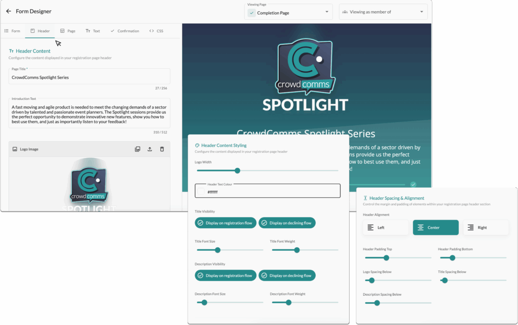 You can set the page title, add introductory text, upload a logo, and fully customise the size, colour, and positioning of your header elements.