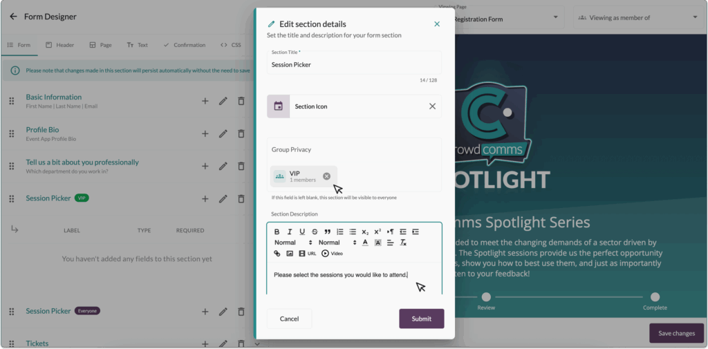 When fine-tuning your section, you’re in control. Edit the Section Title and Icon to ensure clarity and cohesion within your form. Want to tailor visibility? Add a ‘Group’ to restrict access to specific people groups, ensuring information is shared selectively. And for added context, enrich your section with a description.