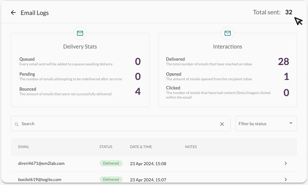 Ready to explore your email logs? Start by clicking the “View Logs” button on one of the three tiles below. This action will direct you to a focused dashboard designed specifically for the selected email type.
