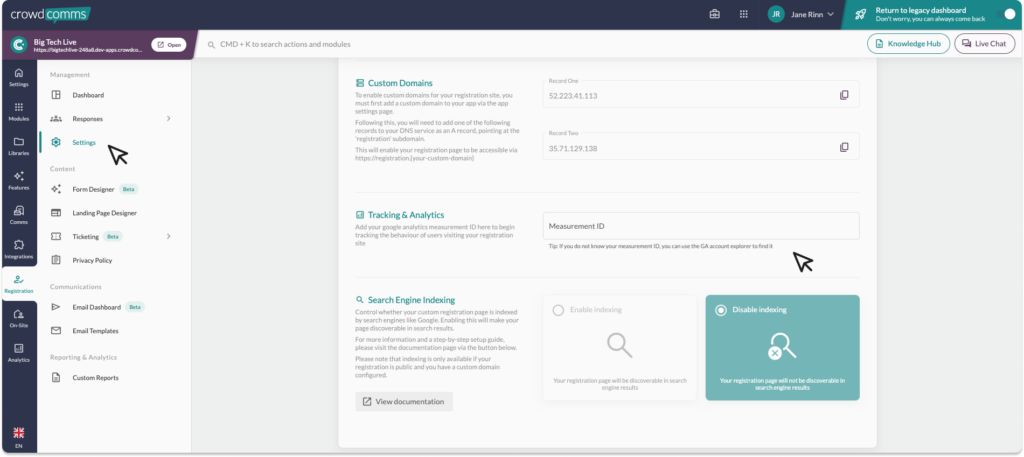 - In the Registration Settings page, look for the section labelled Analytics Settings.