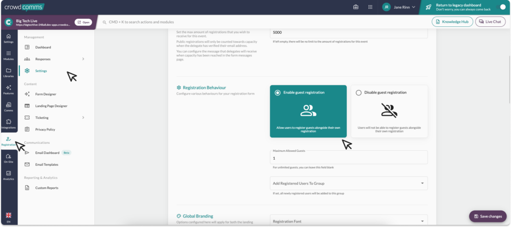 - Scroll down to the ‘Registration Behaviour Section’ and toggle on ‘Enable Group Registration’