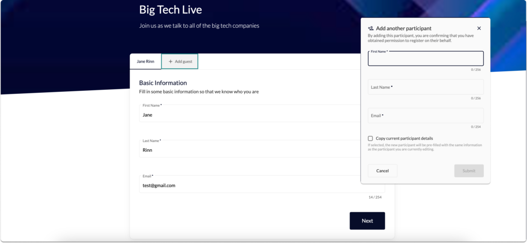 - Registrants can add another person to their registration via an “Add Guest” button.