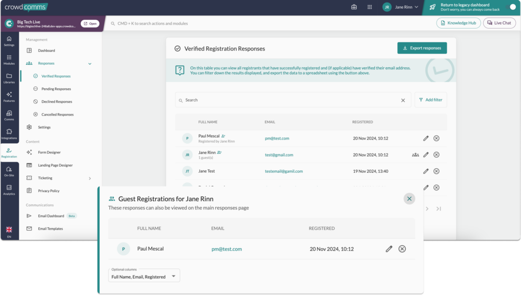 - With in the responses table the guest registrants are clearly labeled with ‘Registered By’.