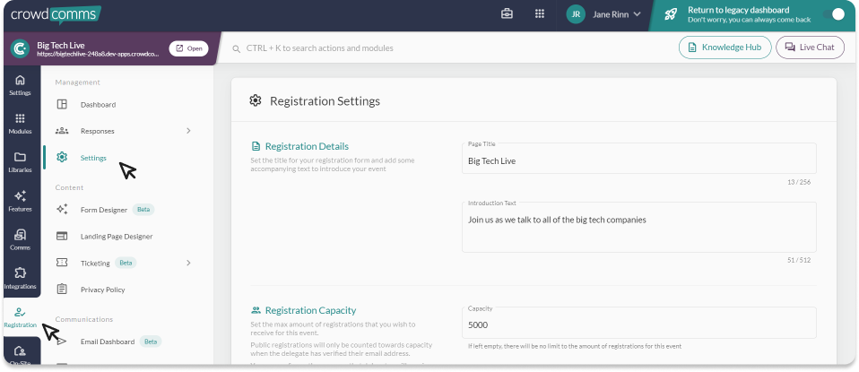 - Registration Capacity – In this section, you can set the maximum amount of registrations that you wish to receive for this event. You can also configure the message that delegates will receive when capacity has been reached.