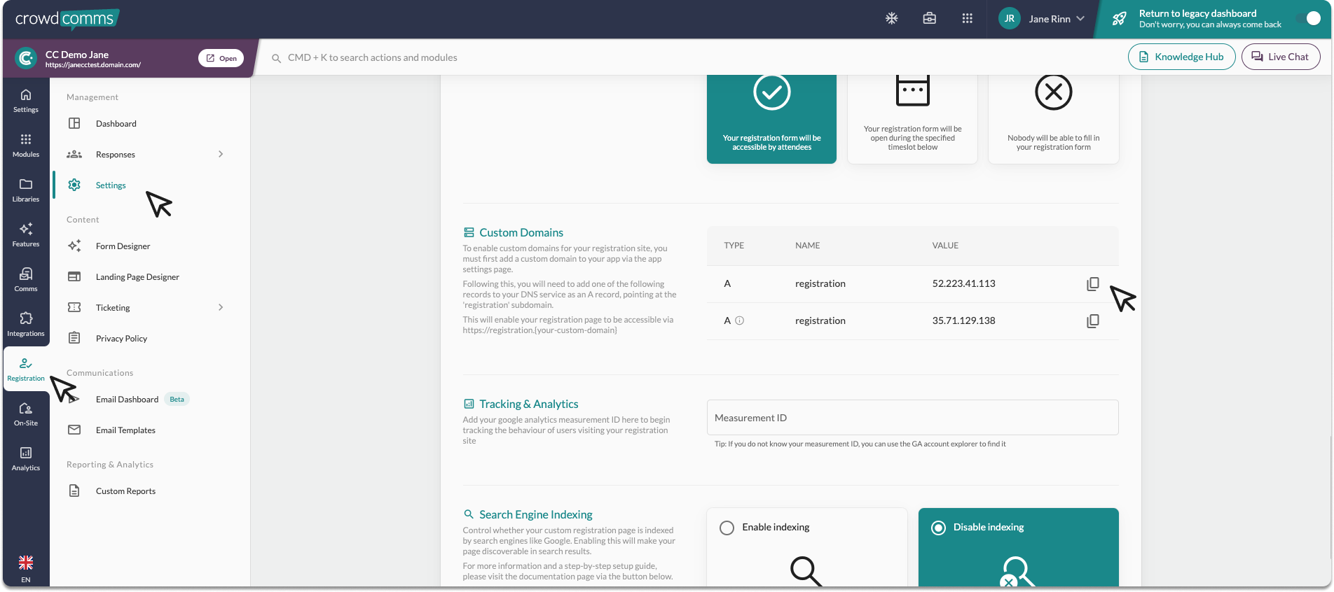 - After this step, the DNS record for your registration site will appear in the Registration Settings tab, under the Custom Domains section. You’ll need to add one of the listed records to your DNS service as an A record, pointing it to the ‘registration’ subdomain.