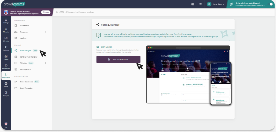 To start creating the registration form, navigate to the Registration tab. Then, within the Management section on the secondary menu, click ‘Form Designer’, from here launch ‘Form Editor’.