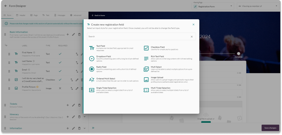 There are different options of field types you can add to the registration form, and they are: