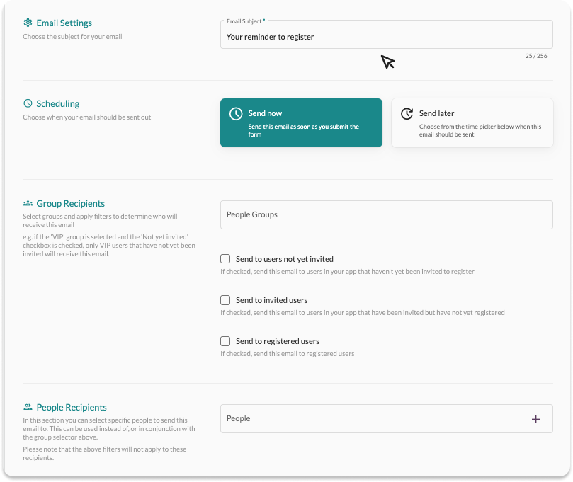 For example, if you wish to send accommodation details to VIPs who have registered, select ‘VIP’ from the ‘People Groups’ field and tick the ‘Send to Registered Users’ checkbox.