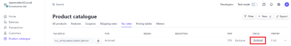 - If you need to change the tax rate or edit the label, edit it in the CMS and this will flow through to the active rate in Stripe.