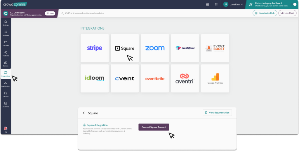- Once you have completed the prompts, your Square account will be linked to the CMS and ready to accept payments via your registration form.