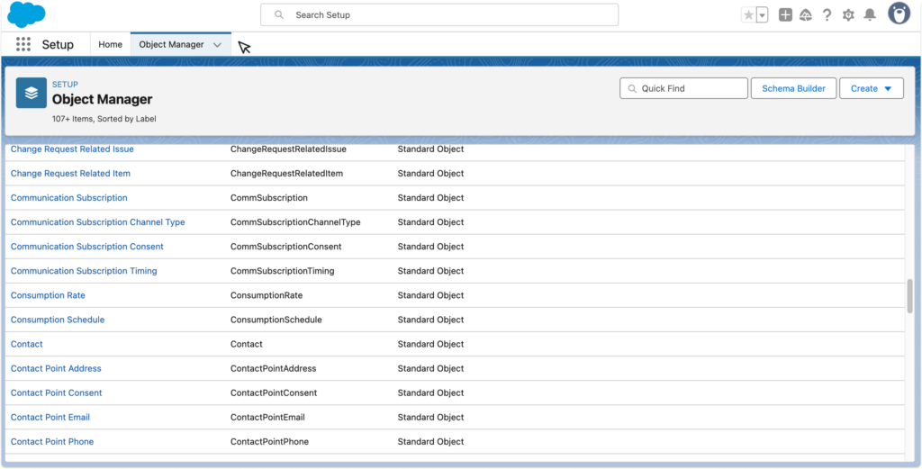 12. To get the Contact Object Name for the CMS (this will be the table where you wish to extract the data from in Salesforce to go to the CMS) open the Object Manager tab, and scroll to find the label you require. Copy the API Name field and save to the notepad.