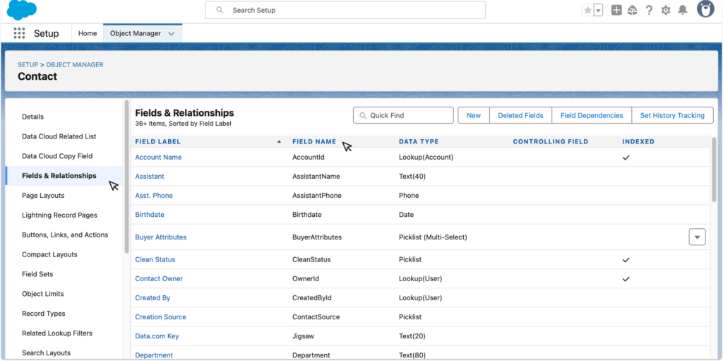 13. Next you will need to click on that label, for this guide we have chosen the Contact label and within the details page open Fields & Relationships from the left side bar menu. Here you will find the external mapping IDs required for the CMS for each data field you wish to map over. Simply copy over the Field Name for the data fields you wish to map to the CMS.