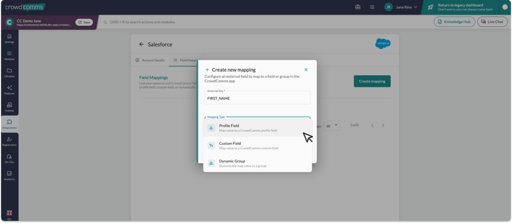 • Customised Data Mapping: Tailor the integration to your specific needs by mapping Salesforce field keys to profile fields, custom fields, or dynamic groups within our CMS, allowing you to keep contact details up to date while also recording registrations, badge prints and session check-ins!