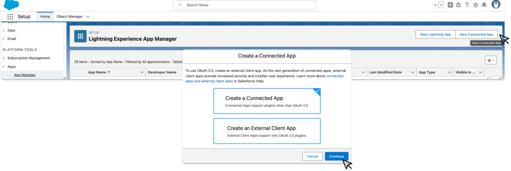 On the right side of the window, select the New Connected App button, and in the dialog window select Create a Connected App, then select continue.