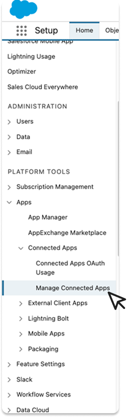 7. Navigate back to the Manage Connected Apps page using the menu on the left side of the screen as shown.