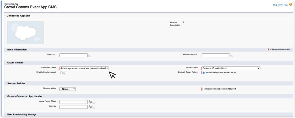 9. In the OAuth Polices section under Permitted Users, set the dropdown to Admin Approved Users are Pre-Authorized,  and select OK in the dialogue box.