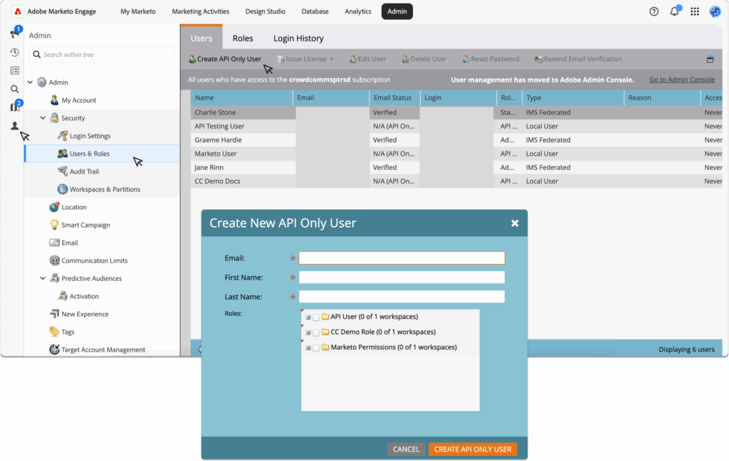 - On the left side menu, select the Person Icon as shown in the image above, this will open up the Admin menu. Within the Admin sub menu, select Users & Roles. Here we will need to create an API-Only user for the CrowdComms CMS integration.
