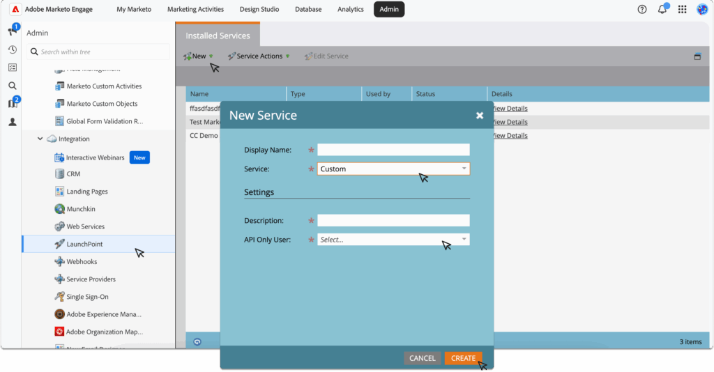 6. Navigate back to the left side menu and select Launch Points. In the Installed Services tab, select the New+ button to create a new service.