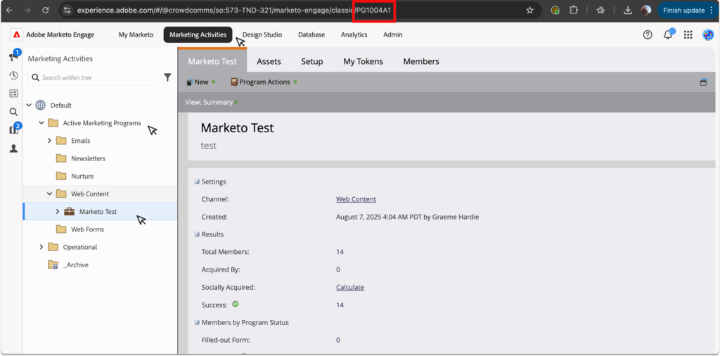 9. Next you will need to obtain your Program ID. On the top navigation menu, select the Marketing Activities tab. In the new left side menu under Active Marketing Programs select the appropiate program for your integration. For the purposes of this document, we have chosen ‘WebContent > Marketo Test’ as shown below. This will be different on your Marketo set up.