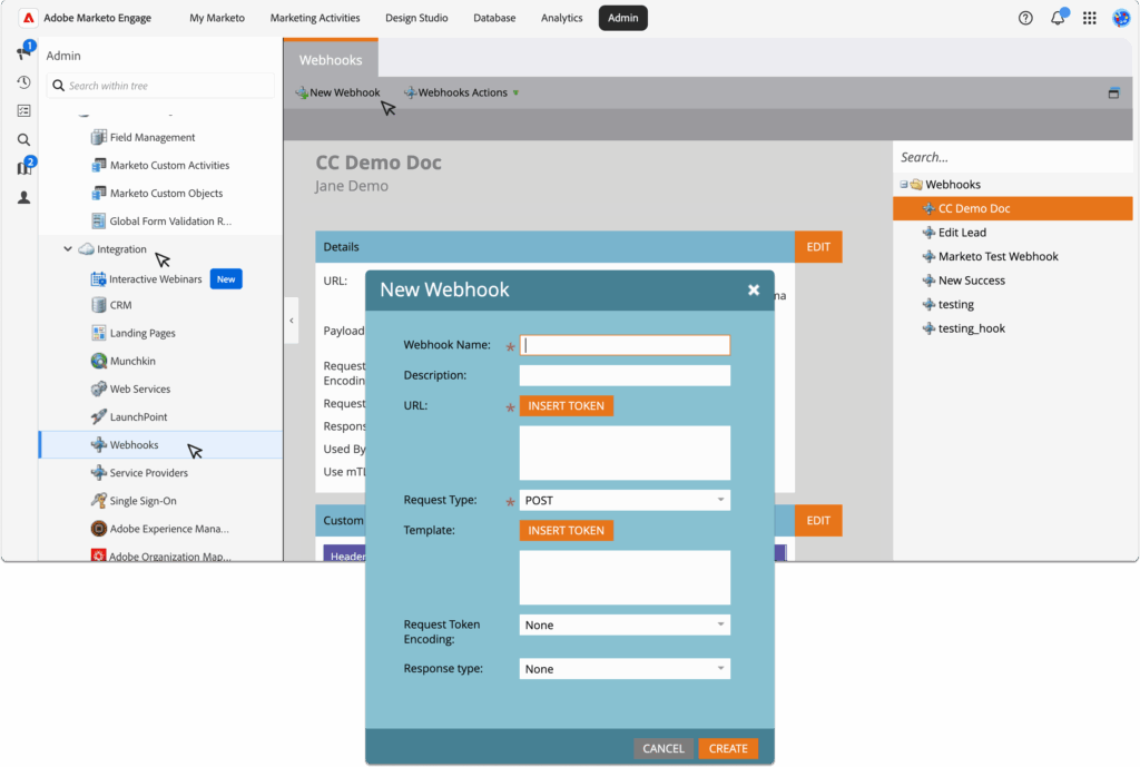16. Navigate back to your Marketo browser window, and go to the Admin menu. Within the submenu, select Integrations > Webhooks. In the Webhooks window select: New Webhook+.