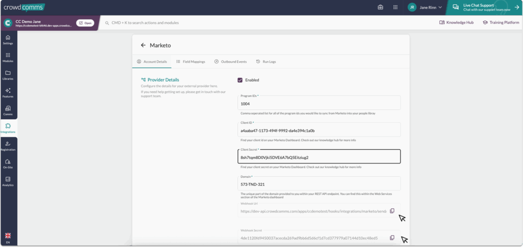 - If a webhooks template has been incorrectly configured or any other issue occurs during the sync via the webhook; either send the webhook again at a later time or disable and re enable the integration to perform another sync. Note: This will override any changes in the CrowdComms people library by performing a full sync of the programs you have provided. It’s best to run this only after the outbound sync has completed.