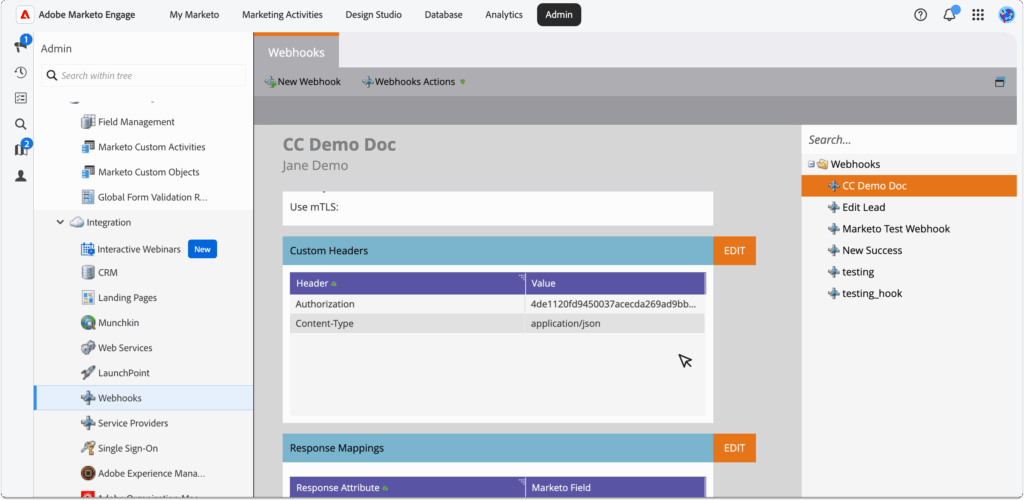 15. We will need to set up a Webhook in Marketo using these details to allow Marketo to send the data to the CMS.