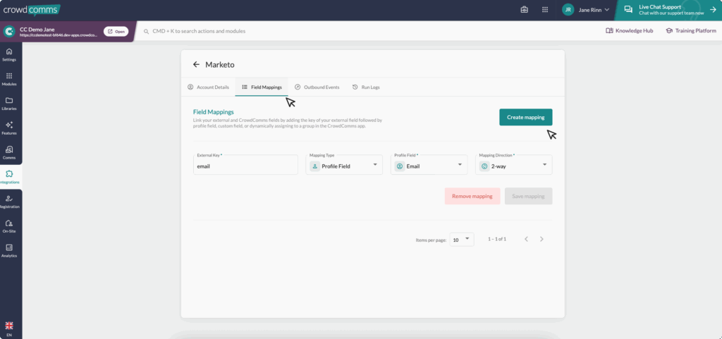- Navigate to the Crowd Comms CMS browser again, to the Field Mappings tab, and select Create Mapping.