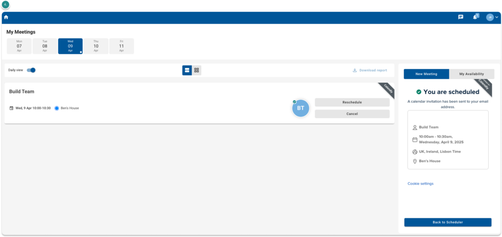 Once selected, you’ll see a calendar view where you can choose your preferred date and time slot. Simply pick the options that work best for your schedule. After that, you’ll be prompted to enter your contact details and include a message for the representative you’d like to meet with.
