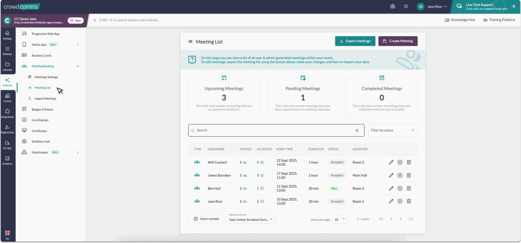 The Meeting List View Page provides event organisers with a centralised interface to manage and track all meeting activities efficiently. From this page, users can quickly create new meetings, cancel, edit or delete existing ones, and use filtering options to easily locate specific meetings. A dedicated stats panel offers at-a-glance insights into total upcoming meetings, pending requests, and completed sessions, ensuring users maintain full visibility and control over their scheduling workflow.