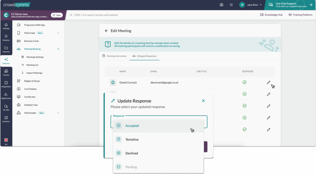 On the Meeting List table, you can Edit your meetings by selecting the pencil icon. This will open a view of the meeting details which can be updated, and it will also allow you to view Delegate Responses. On the delegate responses tab, you can view existing responses. By clicking on the pencil icon, you can update their response to Accepted, Tentative or Declined, giving you full control over your event.