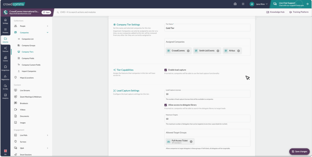 - Allow Access to Delegate Library: If enabled, companies will be able tosearch the delegate library to target leads.