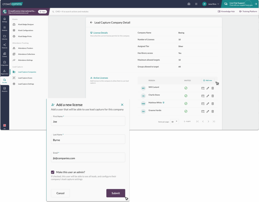 Before inviting companies to the Lead Capture app, you’ll first need to assign available licenses to a delegate. By default, licenses are automatically assigned to the main company representative you’ve already set up when adding your company to the Company Library.