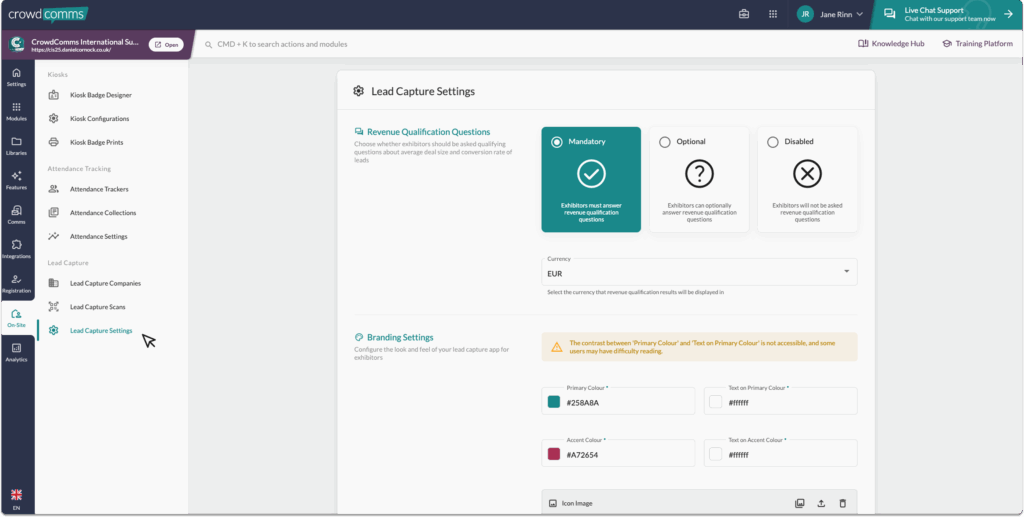 Choose whether exhibitors should be asked qualifying questions about average deal size and conversion rate of leads at login in and set the applicatible currency. You can choose from Mandatory, Disabled or Optional.