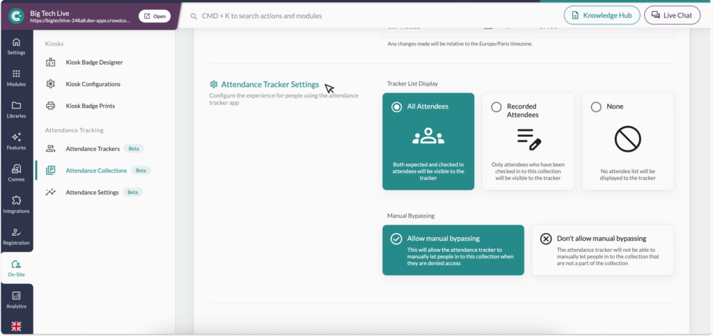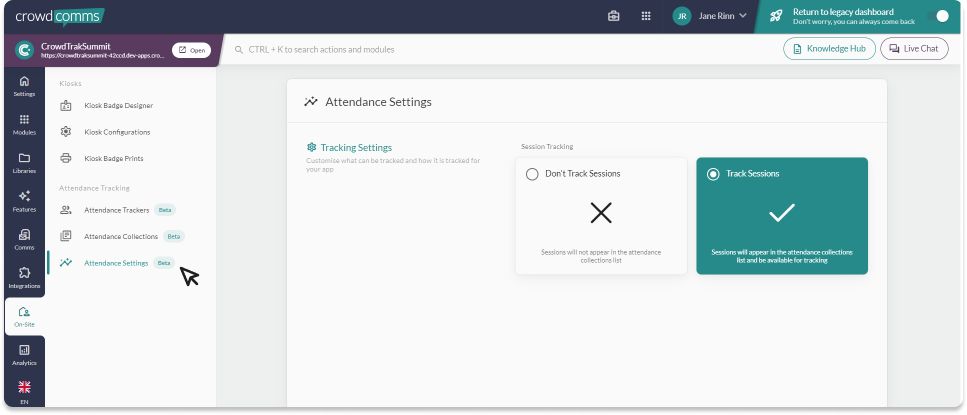 Once within the app on the CMS, navigate to the left side navigation menu and select the ‘On-Site’ tab. In the secondary menu you will be able to see the ‘Attendance Tracking‘ section and the subsequent features.