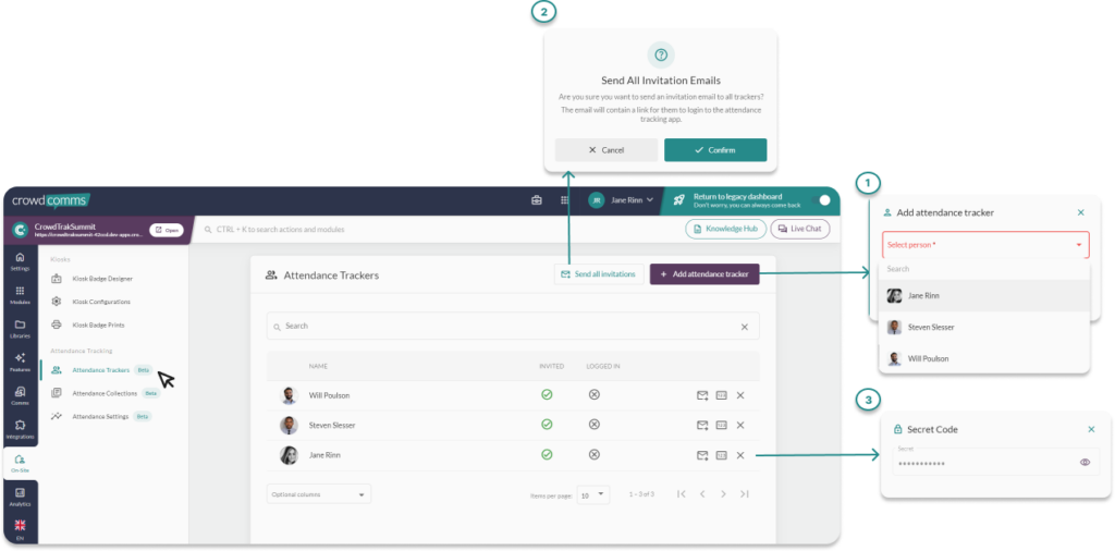 Within the ‘Attendance Trackers Tab‘ you will be able to manage event staff access to the CrowdTrak web application.