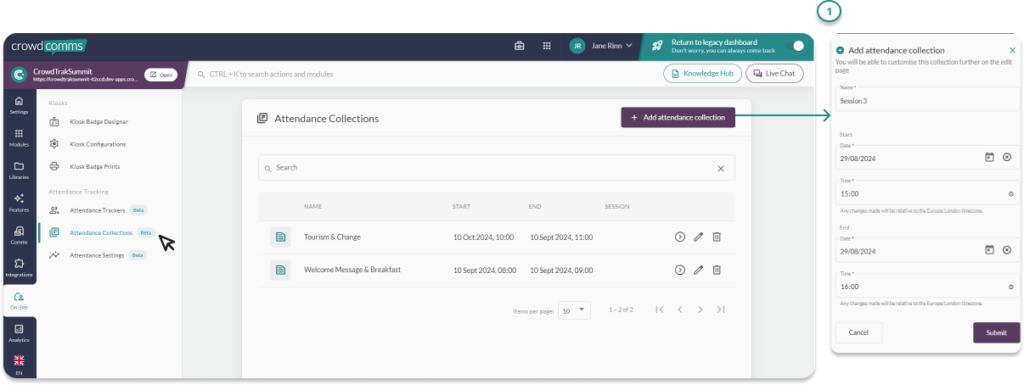 - In the pop up modal you can name your session and set the start/end date and time. Once configured, select submit to see your session populate in the table. You can edit the name, collection type and date or time by selecting the pencil icon next to the session in the table. To delete a session select the bin icon.