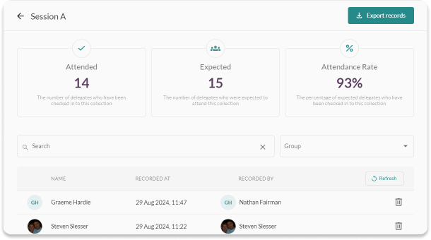 There is also a table listing all scanned attendees, which is searchable by name and can be filtered by group. The button on the top left ‘Export records’ with export an Excel report for this session. The Excel includes: