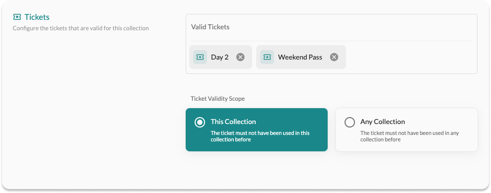 - To add tickets that will be accepted to the collection, select the pencil icon on your newly created collection, and in the Edit Collection page navigate to the Tickets section. Use the drop down to apply the relevant tickets. Set the Ticket Validity Scope and Save Changes.