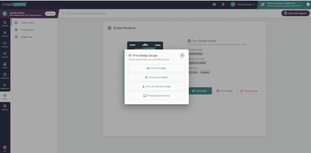 1. You are now ready to print a badge. Go to the Kiosks section on the CMS and click Print design. From here Print an individual badge. If you badge has not printed out correctly, check steps 4 – 9 have been completed correctly.