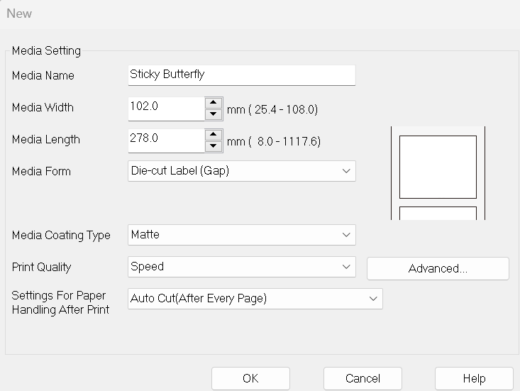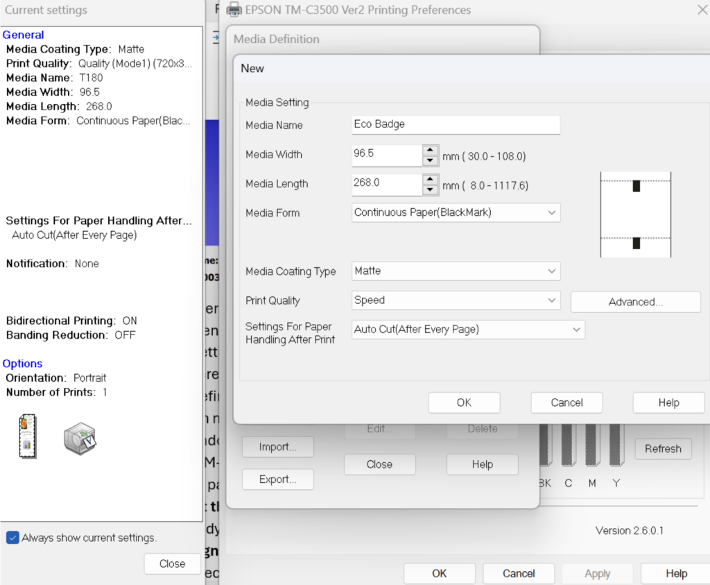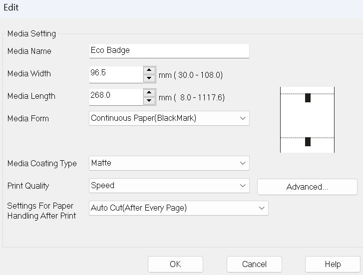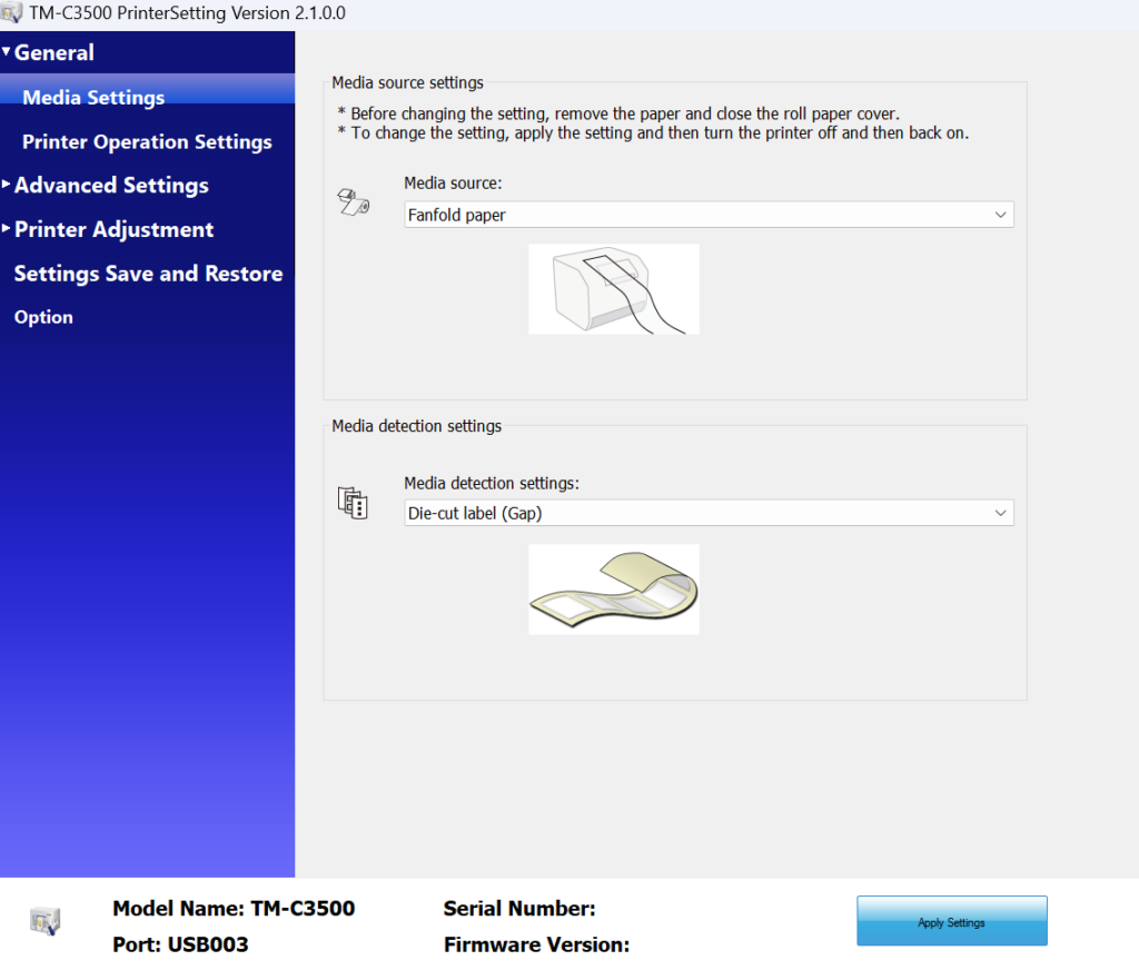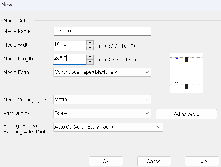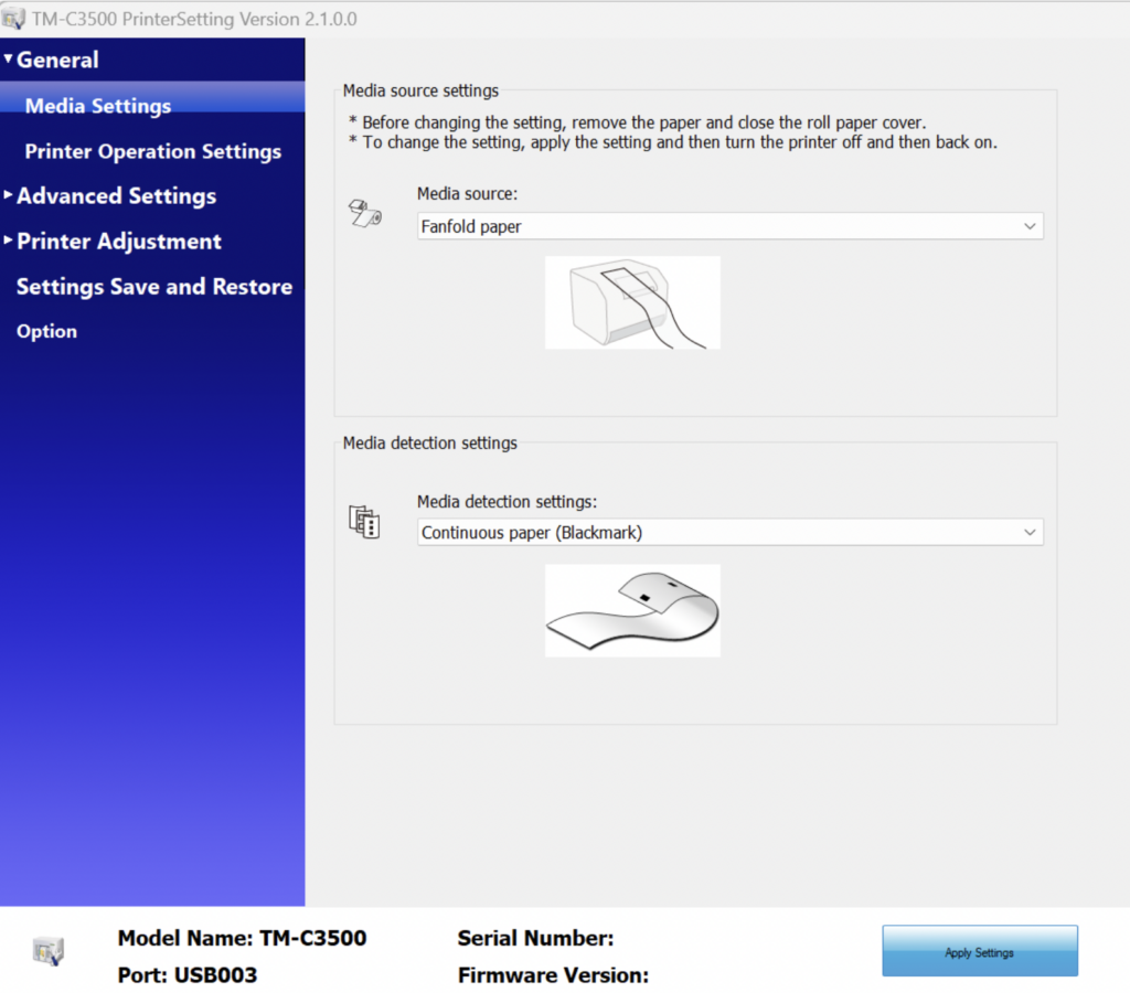 1. Change Media Source to “Fanfold paper”, and Media detection settings to “Continuous paper (Blackmark)”