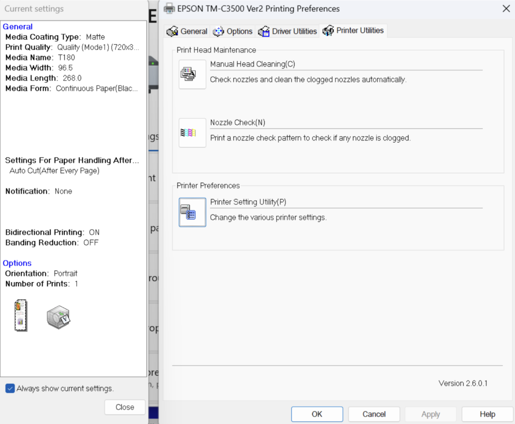 1. Go to the printer utility settings (Settings>Bluetooth & Devices>Printers & Scanners>Epson TM-C3500 Ver2>Printer Preferences>Printer Utilities>Printer Setting Utility(P)