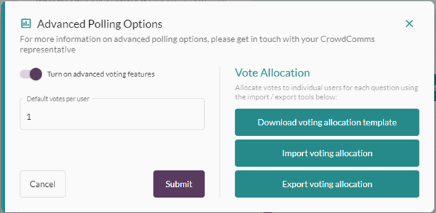 - Within the now selectable “Vote Allocation” section of the “Advanced Polling Options” modal, click on the Download Voting Allocation template. This will begin the download to your local device of the template.