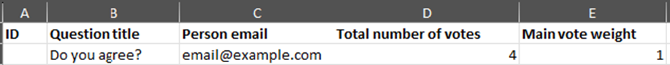 - Save this template locally so that editing in preparation for the import file upload onto the app can take place. On the template there are 5 columns; ID, Question title, Personal email, Total number of votes and Main vote weight. Some fields are pre-populated with example content to assist in editing. Please ensure these pre-populated fields are overwritten with the required updated content.